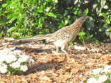 Later in the afternoon while I was hand-watering the roses, I heard a short sound by the rear hedge that got my attention. I looked to my left and saw the roadrunner on the far side of the pool. I left the area and went inside through the garage so as to not disturb the roadrunner. Shirley and I watched the roadrunner moving around in the back yard until it disappeared behind some shrubbery.